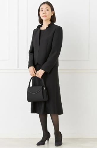 40代女性の喪服とは、光沢のない黒のブラックフォーマルのことを指します。一般的にはワンピース+ジャケットのアンサンブルスーツが定番ですが、パンツスーツやワンピース単体を選ぶ方も増えています。