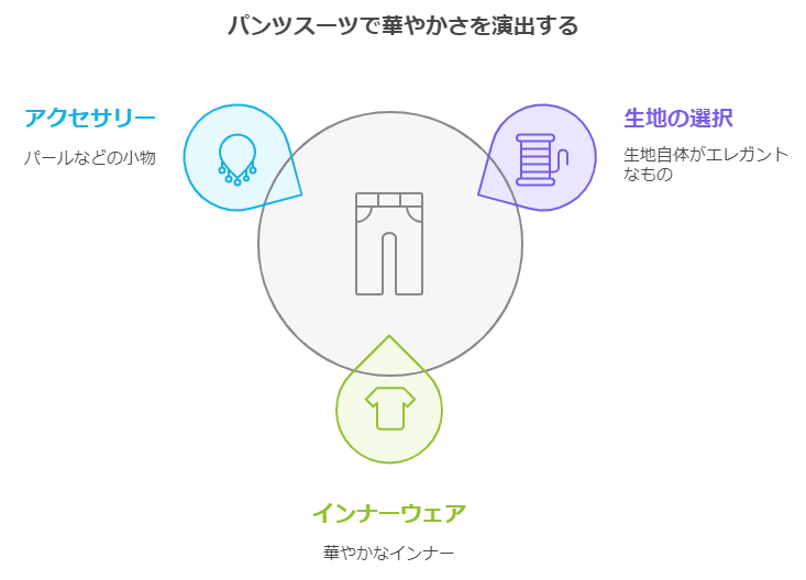 フォーマル着としてパンツスーツを着る場合は、生地自体が華やかであったり、インナーを華やかなものにしてあげると、場に馴染む服装になりますよ。