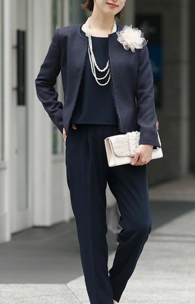 迷ったら、ネイビーやベージュのフォーマルパンツスーツでOK!